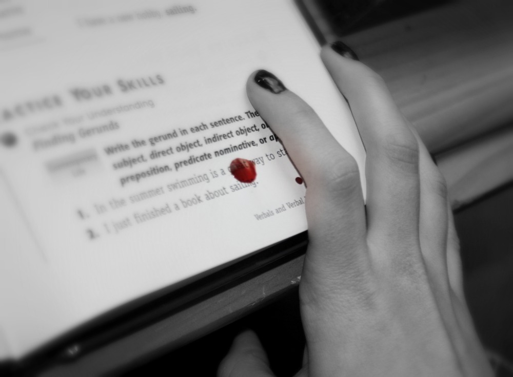 First off, I have a confession to make. Today I had a bloody nose. Yes, yes. It bled. And bled. And bled. And I'm infected with notarealinfectionitis. I know. It's scary and deadly. But in fact, while said nose was bleeding, it dripped onto page 191 of my English book as I was finishing up an assignment. I set the book down, pinched my nose, and ran across the hallway into my room to grab a kleenex or 5. It was honestly a long nose bleed. And also, as my nose bleeds always do, blood came from my mouth. During the whole adventure, at one point the blood from my mouth embarked onto my pale, slightly chapped lips. As I was about to wipe it off I had to stare in the mirror that I had been facing for a moment. I really was looking like a vampire, and not only that but it all looked like.... a twisted and haunting beauty. I went to cleanse my face and was still thinking about it's disgusting beauty from earlier wishing that I had gotten a picture of it. After my face had no sign of gore, I went back to my sitting place and stared at my English book as an idea was swirling in my head. I grabbed the Canon EOS digital rebel xti that was sitting on the computer desk from earlier along with the English book that was still open and went back into my room. Although, by the time I'd finished cleaning up, the blood on my English book had more or less stiffened to the point that if I tried to wipe it off, it would only rip the weak pages. I didn't have time to be disappointed about that. I didn't even think much about it. As I went into my room, I quickly painted the nails my right hand with a black coat of polish and created my idea. I dimmed the lights and went to work. Afterward, as horrific as it looked, I loved it. Here are my favorites or the results.